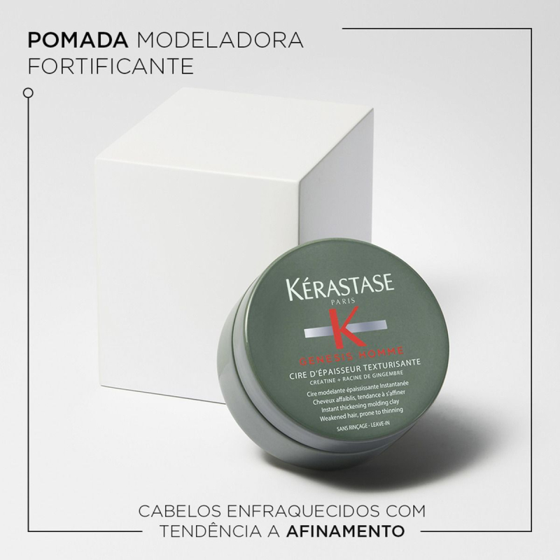 Pomada Modeladora Kérastase Genesis Homme. Ela é a solução definitiva para modelar e dar textura aos cabelos com tendência ao afinamento, garantindo um resultado duradouro, com um acabamento sofisticado e natural.
