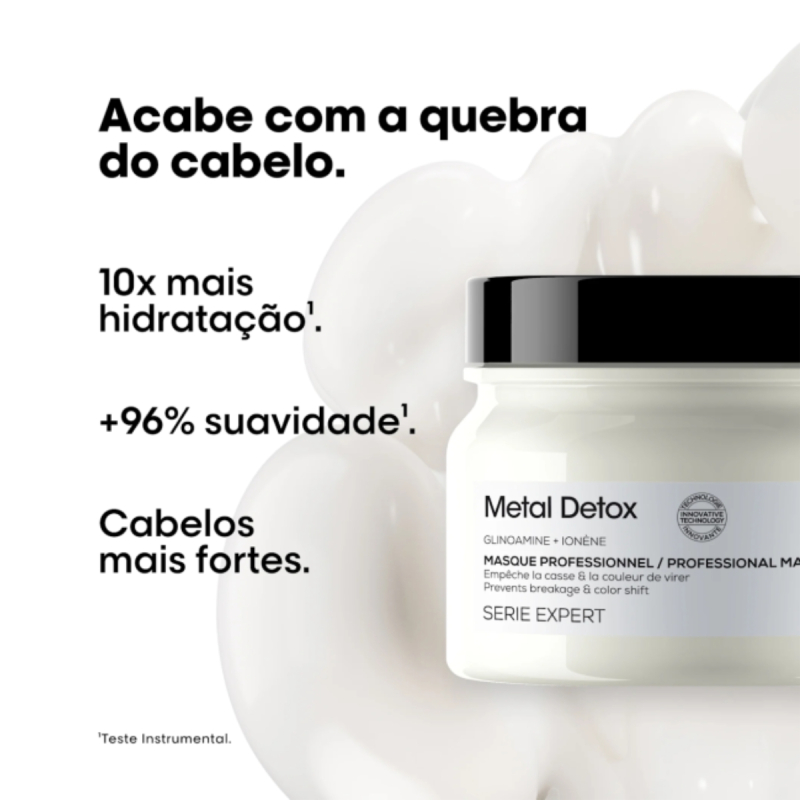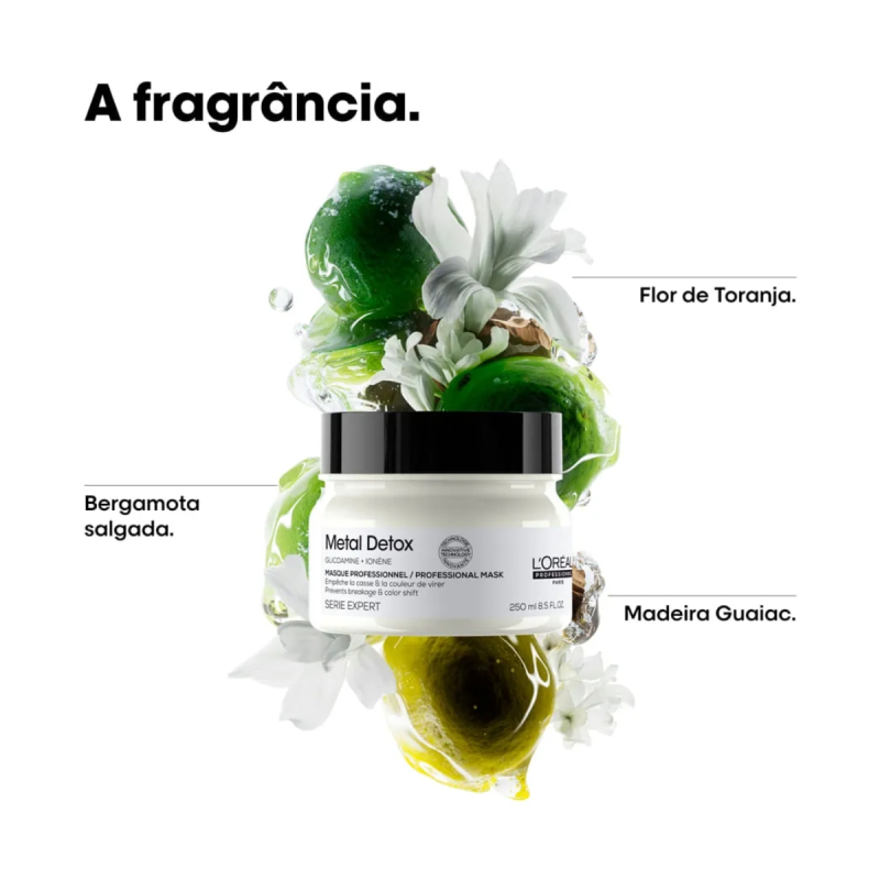 EntendiSe você faz coloração, mechas ou descoloração, o seu cabelo se torna mais poroso e absorve mais metal, o que aumenta o risco de danos. Usar a máscara Metal Detox é o seu seguro contra a quebra e o desbotamento indesejado. Ela não só protege contra novos depósitos de metal, mas também deixa o cabelo mais macio, brilhante e pronto para receber o próximo serviço químico com 100% de confiança no resultado da cor.