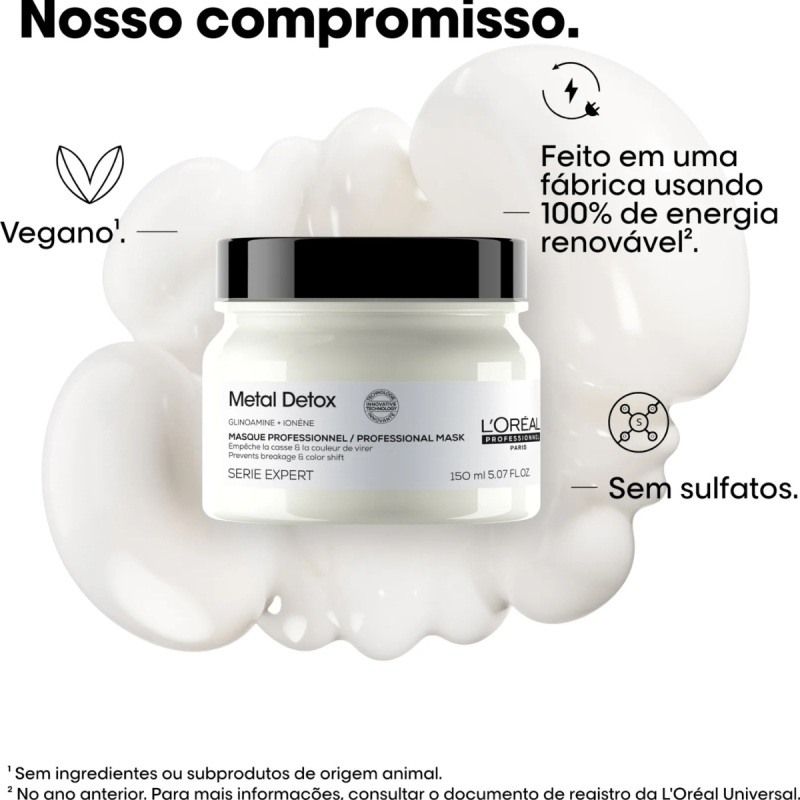 É super simples! Após usar o shampoo da linha Metal Detox, aplique a máscara no cabelo úmido, do comprimento às pontas. Deixe agir de 3 a 5 minutos para que os ativos ajam profundamente. Em seguida, enxágue completamente. Use de 1 a 2 vezes por semana ou conforme a necessidade.