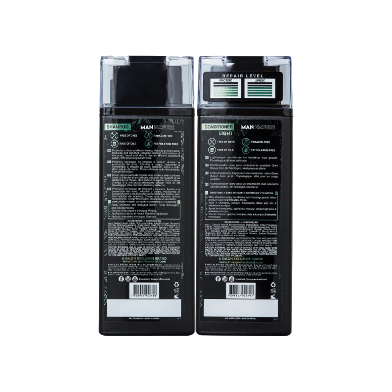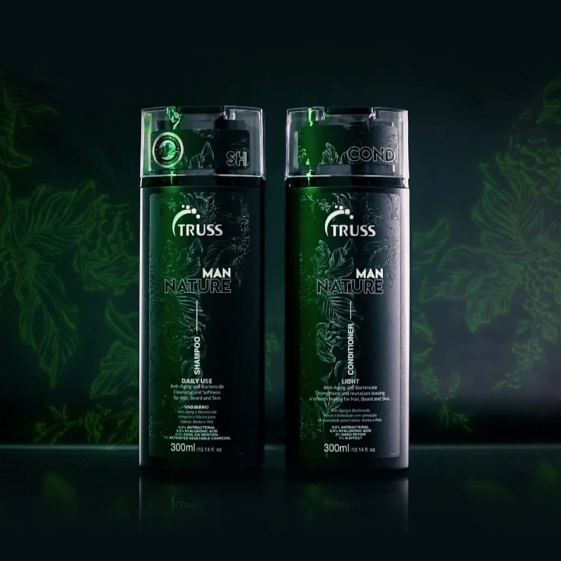 O Kit Truss Man Nature foi desenvolvido para atender às necessidades específicas do cuidado masculino, combinando um shampoo de limpeza profunda e um condicionador hidratante em uma fórmula que previne foliculite, caspa e acne no couro cabeludo, barba e pele. Com ingredientes ativos de alta performance e pH fisiológico, este kit oferece uma experiência refrescante enquanto fortalece e protege os fios e a pele.