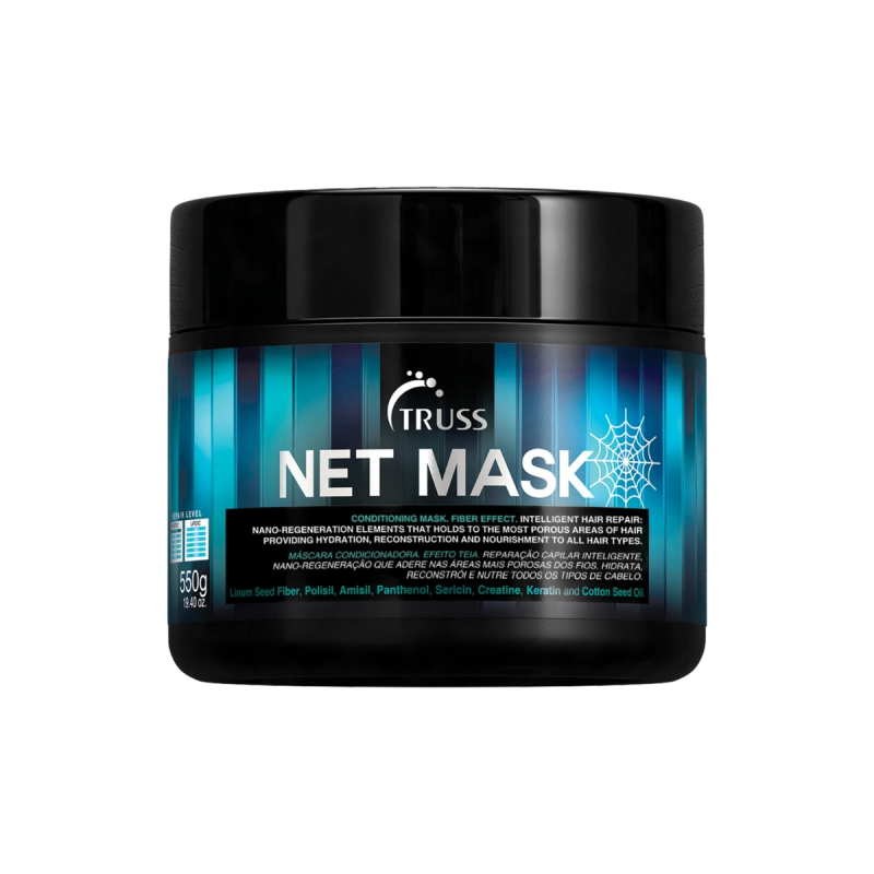Máscara Truss Net Mask – 550g: A Net Mask é ideal para reposição de massa proteica e nano-regeneração dos fios danificados. Ela fortalece, restaura a elasticidade e devolve o brilho natural dos cabelos.