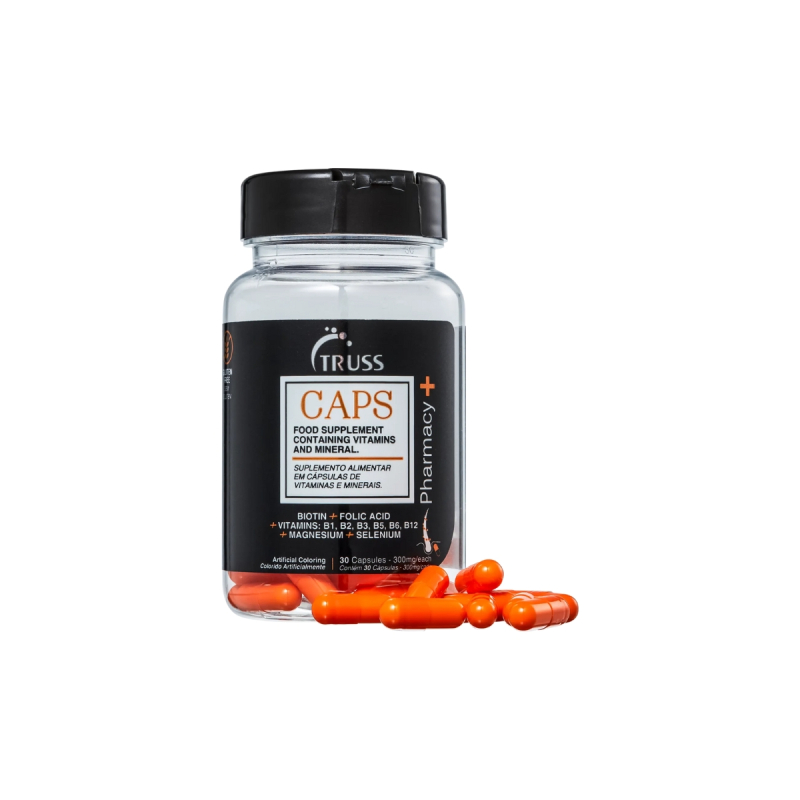 - Truss Pharmacy+ Caps - Suplemento Alimentar (30 Cápsulas): Previne a queda e fortalece os fios. Tome 1 cápsula por dia.