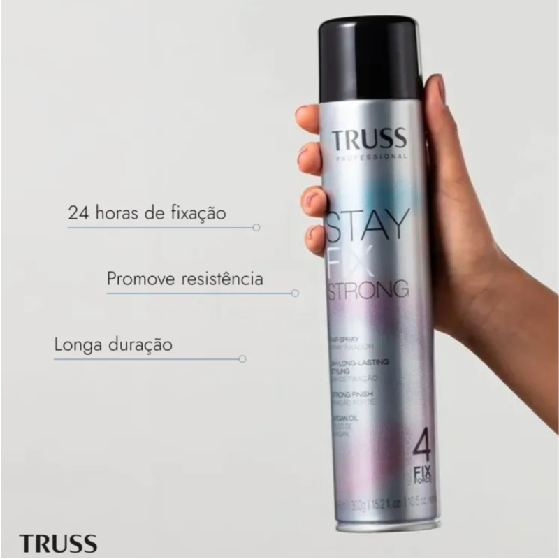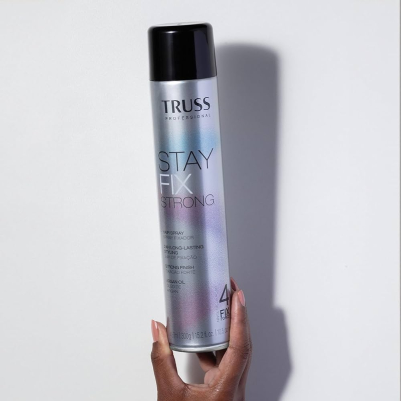 EntendiObtenha a máxima fixação e durabilidade para seus penteados com o Spray Fixador Truss Stay Fix Strong. Com sua fórmula de jato seco enriquecida com Óleo de Argan, ele garante uma fixação extraforte por até 24 horas, sem deixar os fios pesados, rígidos ou com resíduos. É a solução ideal para proteger seus cabelos da umidade e do frizz, proporcionando um acabamento profissional e um brilho suave que mantém o seu look impecável e com movimento o dia todo.
