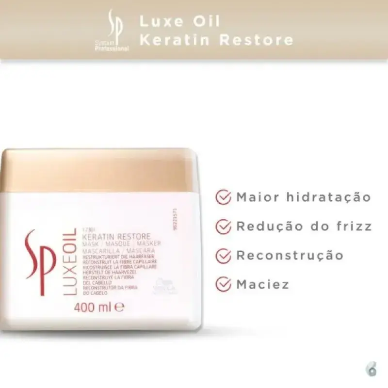Essa máscara capilar é simplesmente incrível! Sinto meu cabelo revitalizado e profundamente nutrido sempre que a uso. O Luxe Oil Keratin Restore da SP System Professional deixa meus fios macios, brilhantes e com uma sensação de leveza. Além disso, o tamanho generoso da embalagem é perfeito para garantir tratamento completo e duradouro. Não fico mais sem!